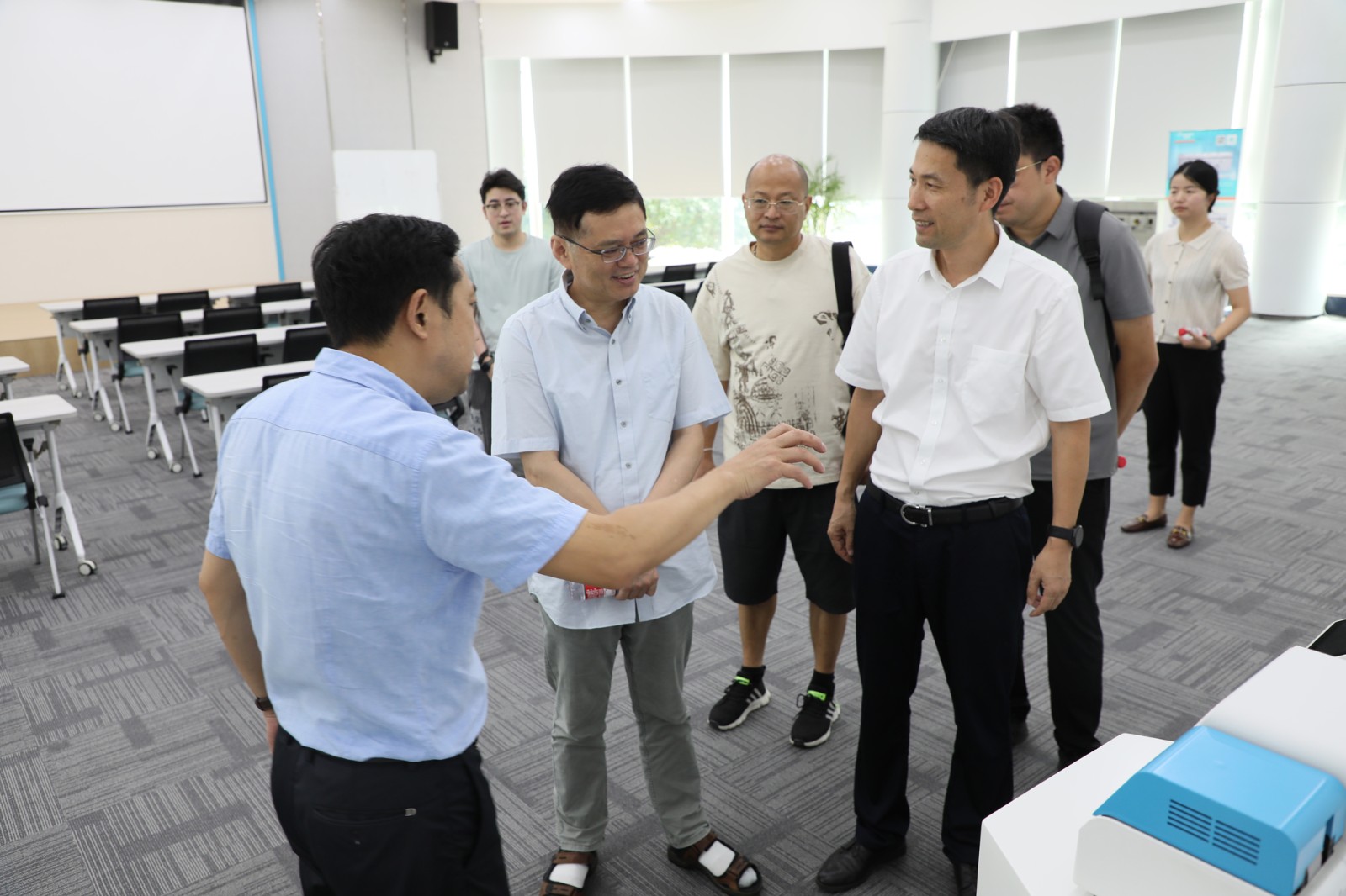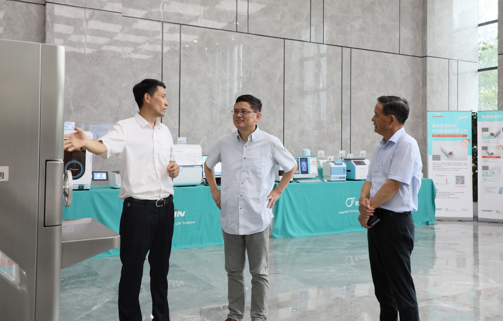 隨后,調研團一行來到泰林生命科學園區(qū),相繼參觀了展廳產品區(qū)、膜技術生產車間、培養(yǎng)器車間、凍干車間和實驗室。沈總向專家們介紹了公司的技術成果、業(yè)務布局、發(fā)展規(guī)劃、創(chuàng)新應用案例等情況,調研團深入感受了“硬科技”加持的制造新力量。